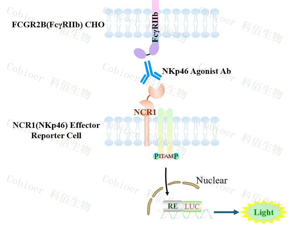 NCR1(NKp46) Effector Reporter 報告基因藥靶模型很好的模擬了體內 NKp46 的信號轉 導過(guò)程,原理見(jiàn)下圖 所示。![]() Figure 1. NCR1(NKp46) Effector Reporter 細胞模型原理圖