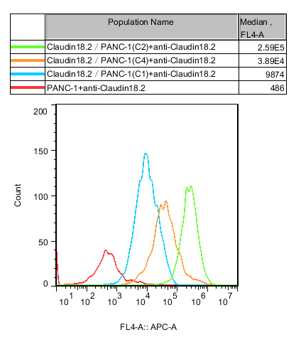 Claudin18是位于細胞膜表面緊密連接的主要成分,它在維持細胞極性和屏障功能以及促進(jìn)耐酸能力方面起著(zhù)重要作用。CLDN18的第一個(gè)外顯子可以選擇性剪接,形成兩個(gè)具有高度同源氨基酸序列的不同剪接突變體(CLDN18.1和CLDN18.2)??缒さ鞍證LDN18由兩個(gè)細胞外環(huán)、四個(gè)跨膜結構域和一個(gè)細胞質(zhì)結構域組成。 |