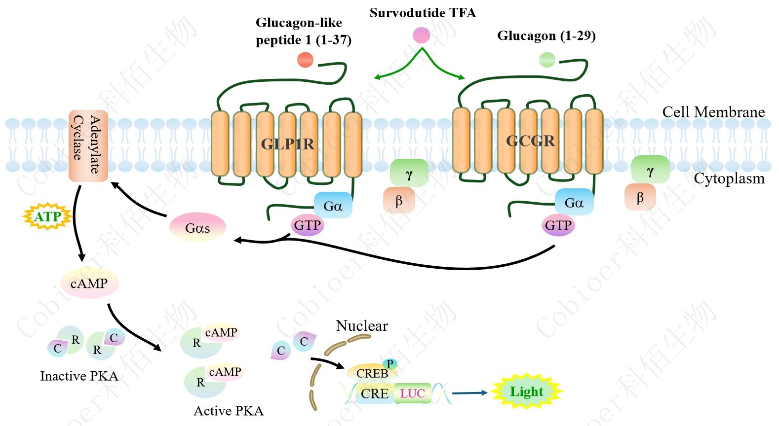 GLP1R&GCGR Dual Reporter Cell 報告基因藥靶模型很好的模擬了體內 GLP1R&GCGR 的信號轉導過(guò)程,原理見(jiàn)圖 1 所示。