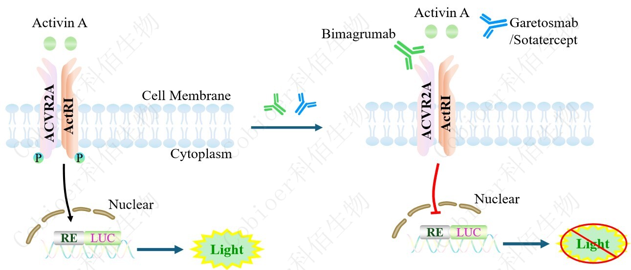 ACVR2A Effector Reporter Cell 報告基因藥靶模型很好的模擬了體內 ACVR2A 的信號 轉導過(guò)程,原理見(jiàn)下圖所示。