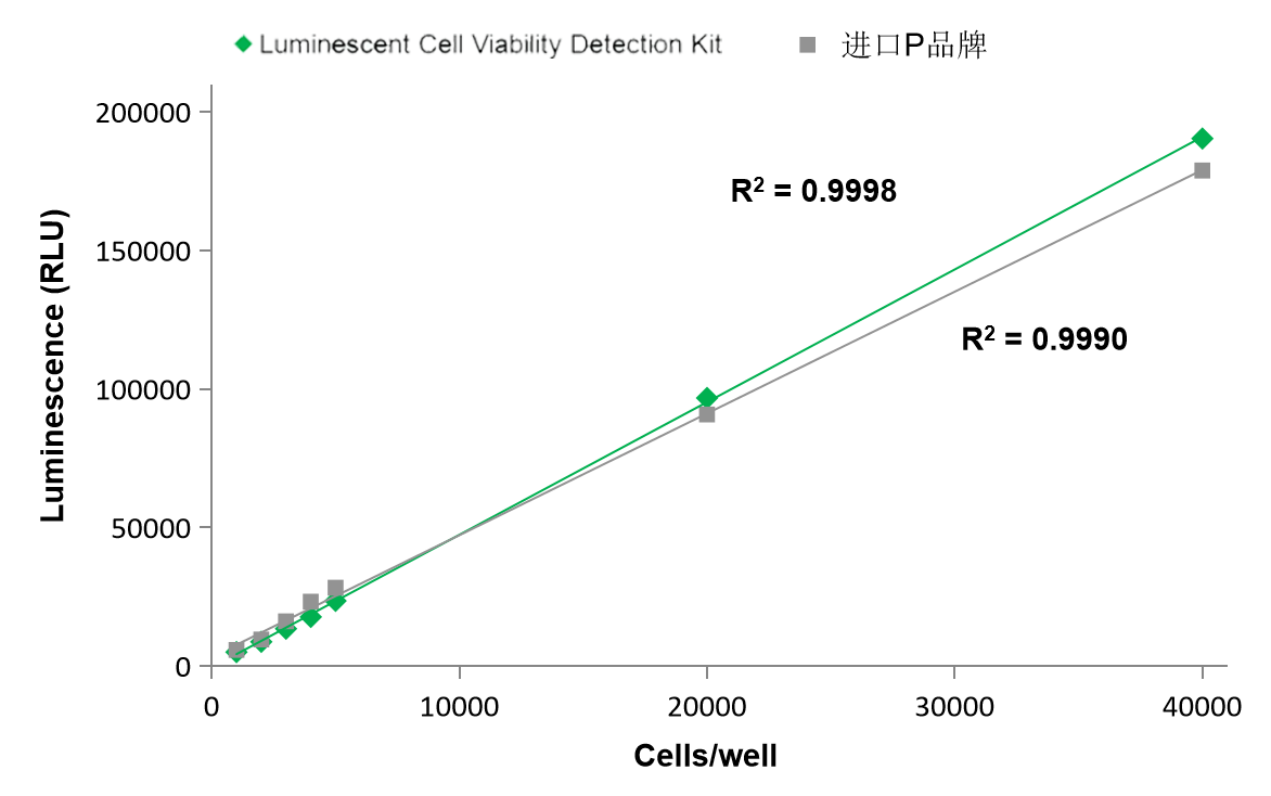 3. 線(xiàn)性 ![]() Figure 4. 比較不同細胞數的線(xiàn)性范圍。分別使用Luminescent Cell Viability Detection Kit和進(jìn)口P公司同類(lèi)對照檢測不同數量CHO-K1細胞(CD-CHO培養基)在黑色96孔板中生物發(fā)光強度,制成標準曲線(xiàn)。