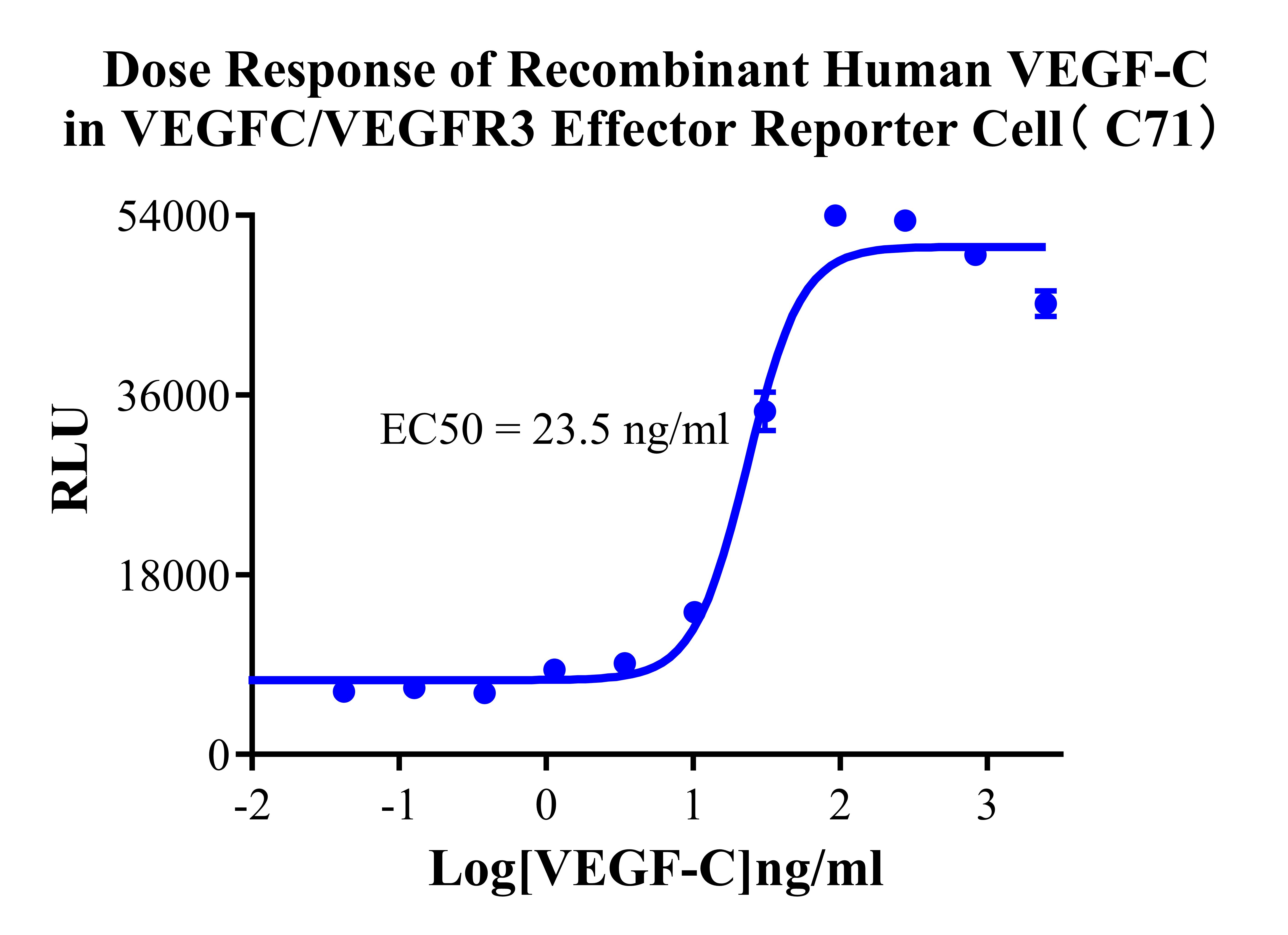 | VEGF 又稱(chēng)血管通透性因子(VPF),是一種二聚體糖蛋白,與細胞表面的 VEGF 受 體(VEGFR)結合,從而激活細胞內酪氨酸激酶,啟動(dòng)一系列參與血管生成和血管生成的 信號級聯(lián)反應事件。在哺乳動(dòng)物中,VEGF 家族有 5 個(gè)成員:VEGFA、VEGFB、VEGFC、 VEGFD 和胎盤(pán)生長(cháng)因子(PGF)。VEGFC 是分泌型二聚體糖蛋白(全長(cháng) 58 kDa),需經(jīng) 蛋白酶(如 ADAMTS3)切割激活為 21 kDa 成熟肽以增強其生物活性,其核心功能是主導 淋巴管生成,在發(fā)育期廣泛表達于心、腎、腦間充質(zhì),成年后主要富集于淋巴管內皮周細 胞、巨噬細胞及腫瘤微環(huán)境,通過(guò)驅動(dòng)胚胎淋巴系統發(fā)育和成體淋巴重塑發(fā)揮關(guān)鍵作用。 VEGF 家族成員以重疊的方式結合三種受體酪氨酸激酶(VEGFR1、VEGFR2 和 VEGFR3)。這些受體都屬于跨膜酪氨酸激酶受體,包括三個(gè)主要區域,即細胞外區域、 跨膜區域和細胞內羧基端。當 VEGF 與其受體結合時(shí),形成同源二聚體復合物,使其蛋白 構象發(fā)生改變,酪氨酸殘基發(fā)生自磷酸化并將信號傳導到下游。 |