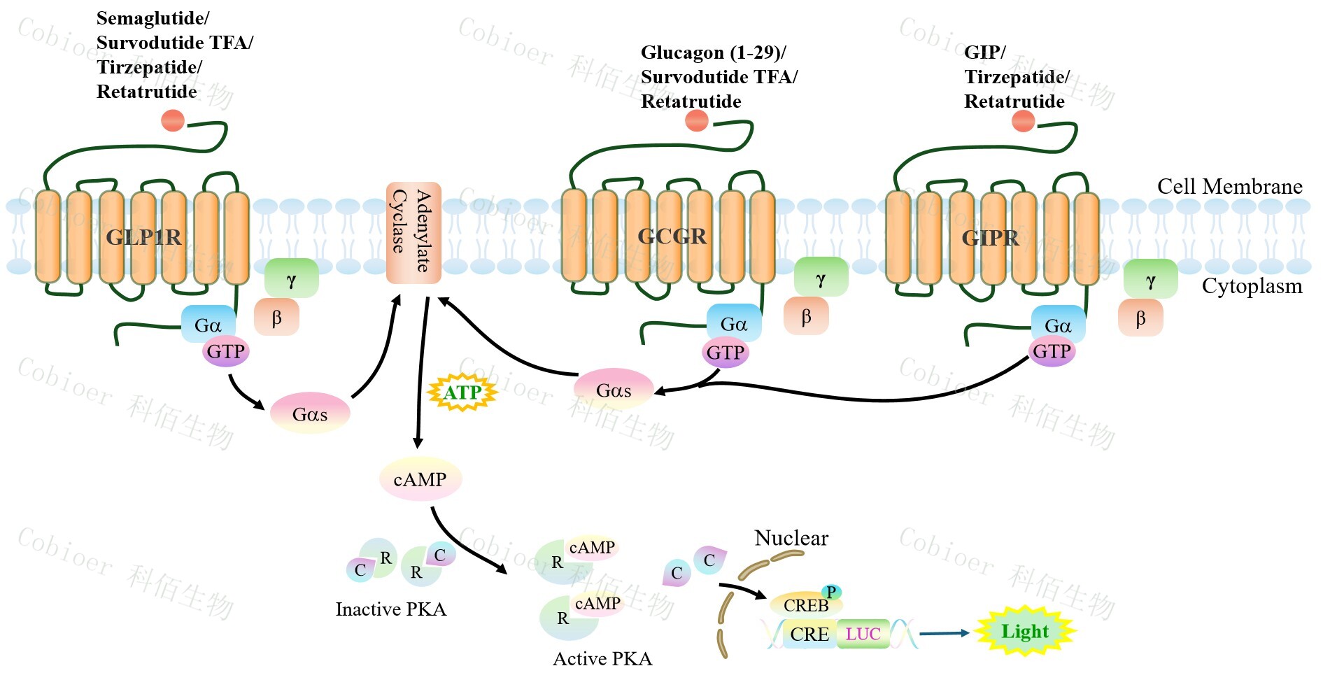 GLP1R&GCGR&GIPR Triple Reporter Cell 報告基因藥靶模型很好的模擬了體內GLP1R&GCGR&GIPR 的信號轉導過(guò)程,原理見(jiàn)圖1 所