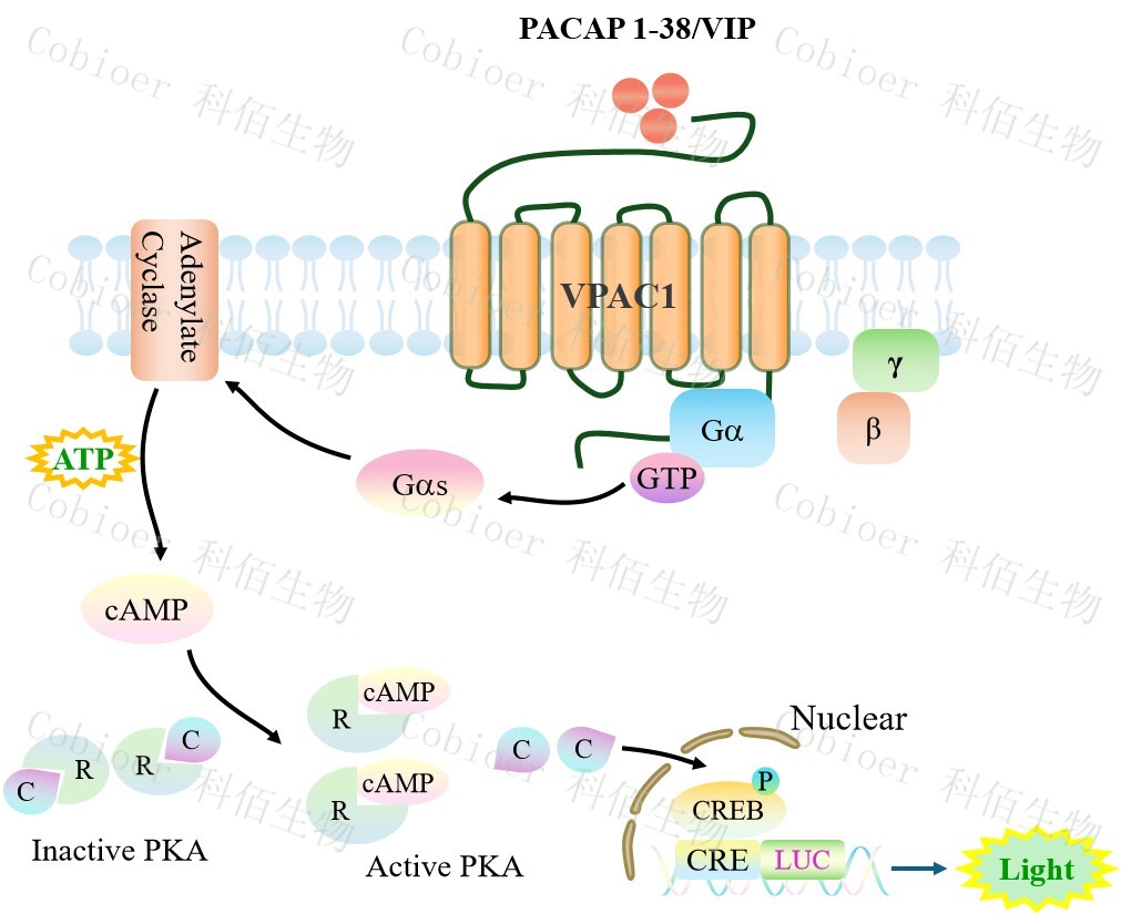 VPAC1 CRE-Luc HEK293 報告基因藥靶模型很好的模擬了體內 VPAC1 的信號轉導過(guò)程,原理見(jiàn)下圖所示。
