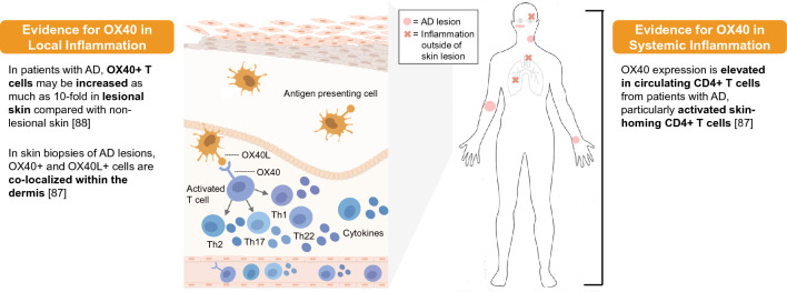 有研究證明OX40通路的激活參與了AD患者的全身和局部炎癥(如下圖所示)。雖然OX40L的表達(主要是單核細胞)在A(yíng)D患者和健康對照組之間沒(méi)有差異,但在A(yíng)D患者循環(huán)CD4+ T細胞中OX40的表達升高。在A(yíng)D患者的外周血中,活化的CD4+ T細胞上OX40的表達比未表達抗原的活化CD4+ T細胞上OX40的表達增加。AD患者病變皮膚中OX40+細胞(可能是T細胞)和OX40L+樹(shù)突狀細胞的數量比銀屑病和非病變皮膚多。一項研究表明,在A(yíng)D患者中,皮損皮膚中OX40+ T細胞比非皮損皮膚增加了10倍之多。在A(yíng)D病變的皮膚活檢中,發(fā)現OX40+真皮細胞和OX40L+細胞(可能是肥大細胞)在真皮內共定位,在角質(zhì)形成細胞上可見(jiàn)OX40L的表達,提示OX40信號的局部活性。