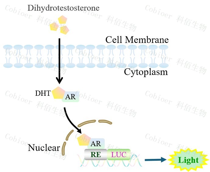 AR Reporter LNCAP Cell(DHT low sensitive)藥靶細胞,在由調控因子調 控并表達報告基因的重組細胞上,穩定表達人 AR。雄激素的代謝產(chǎn)物 DHT(雙氫睪酮) 會(huì )與細胞上的 AR 結合,激活 AR 信號通路,原理見(jiàn)下圖所示。