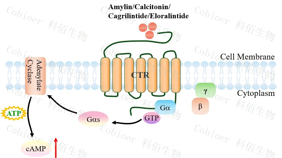 | 降鈣素基因相關(guān)肽(CGRP)家族包括 CGRP 本身、降鈣素(CT)、腎上腺髓質(zhì)素 (AM)和胰島淀粉樣肽(AMY)。 胰淀素(Amylin)受體的三種類(lèi)型的已被確定,即 AMY1,AMY2 和 AMY3。胰淀素 受體屬于 B 類(lèi) GPCR,是異二聚體復合物,由降鈣素受體(CTR)與受體活性修飾蛋白 (RAMPs)結合形成。該受體的 CTR 組分具有相同的 GPCR 結構:7 個(gè)跨膜相互連接的α- 螺旋,將細胞外信號傳遞到細胞內細胞質(zhì)信號級聯(lián)。RAMP 有三種類(lèi)型(RAMP1、 RAMP2 和 RAMP3),它們共享 31%的氨基酸序列,具有相似的基本結構。RAMP 是將 CTR 轉運到細胞膜并調節其配體特異性的重要肽,它可以改變特定 GPCR 的藥理學(xué)、功能 和細胞運輸。 哺乳動(dòng)物細胞中 Amylin 受體的激活已被證明可以提高 cAMP,并被認為與 Gs 蛋白和 腺苷酸環(huán)化酶的刺激有關(guān)。在 RAMPs 的存在下,其與胰淀素的結合親和力可以被修飾。 CTR 和 RAMP1 或 CTR 和 RAMP3 的異質(zhì)結構被認為有利于與胰淀素結合,介導大腦中的 生理功能。AMY3 的激活刺激 G 蛋白 Gαs,進(jìn)一步控制腺苷酸環(huán)化酶(AC),隨后增加細 胞 cAMP。cAMP 與 PKA 調控亞基(R2)的結合誘導 PKA 四聚體全酶解離,導致 PKA 催 化亞基的激活。cAMP 激活的 PKA 參與調控 ERK1/2 的活性。ERK1/2 通路的觸發(fā)可能導致 Ca 2+分布不均勻,引發(fā)內質(zhì)網(wǎng)和線(xiàn)粒體功能障礙,導致細胞死亡。此外,cAMP 刺激 AKT 進(jìn)一步導致轉錄因子 cFos 的表達。 |