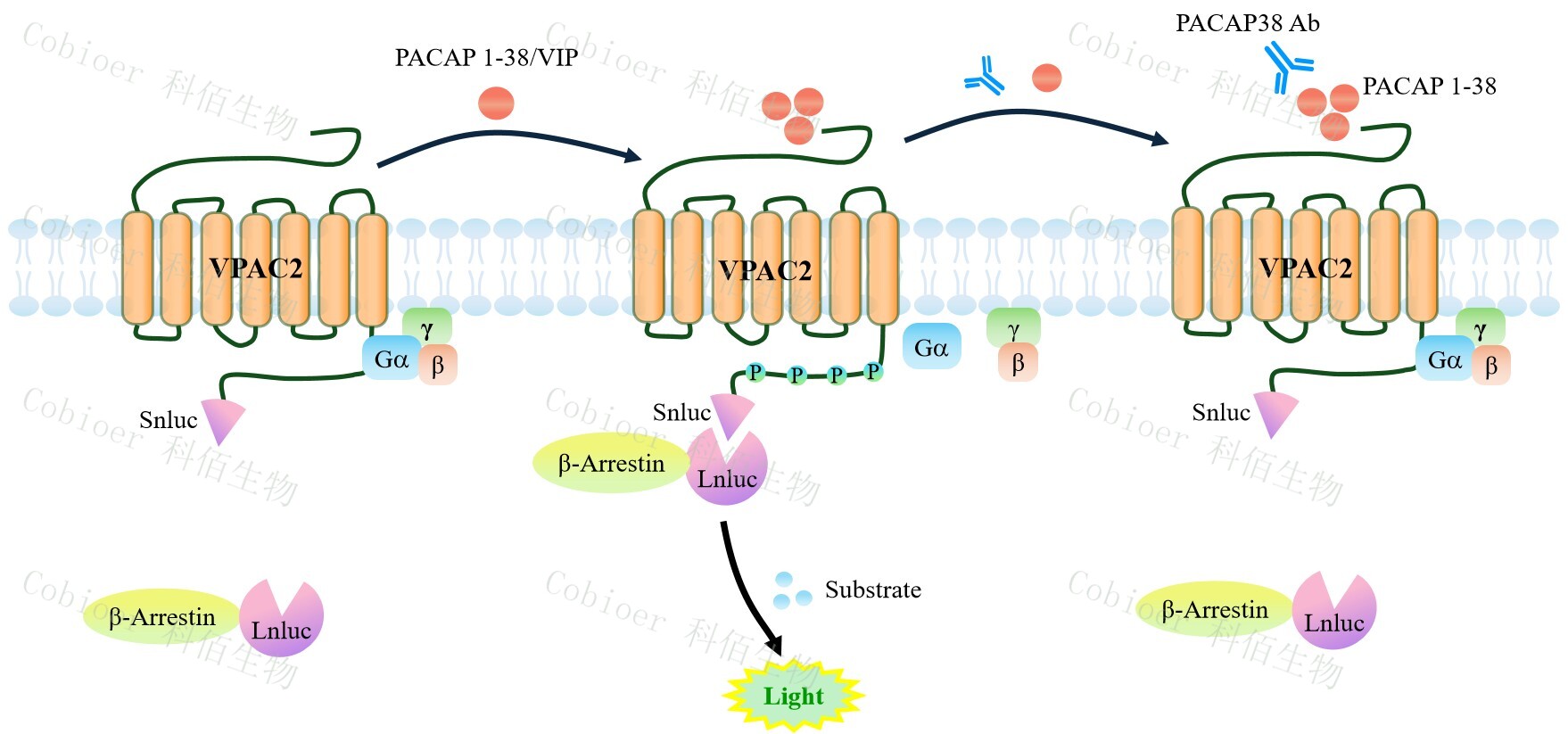 VPAC2 β-Arrestin CHO 報告基因藥靶模型很好的模擬了體內 VPAC2/β-Arrestin 的信號轉導過(guò)程,原理見(jiàn)下圖所示。當缺乏配體刺激時(shí),β-Arrestin 不與 VPAC2 結合,融合β- Arrestin 的熒光素酶處于失活構象,當 VPAC2 遭遇配體刺激時(shí),融合熒光素酶報告基因的 β-Arrestin 被招募,使熒光素酶報告基因處于激活狀態(tài),加入其底物后發(fā)光信號增強。![]() Figure 1. VPAC2 β-Arrestin CHO 細胞模型原理圖 |