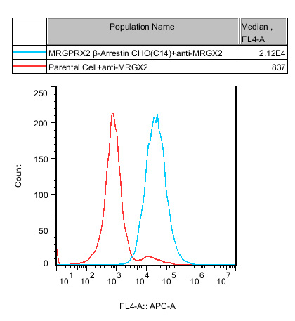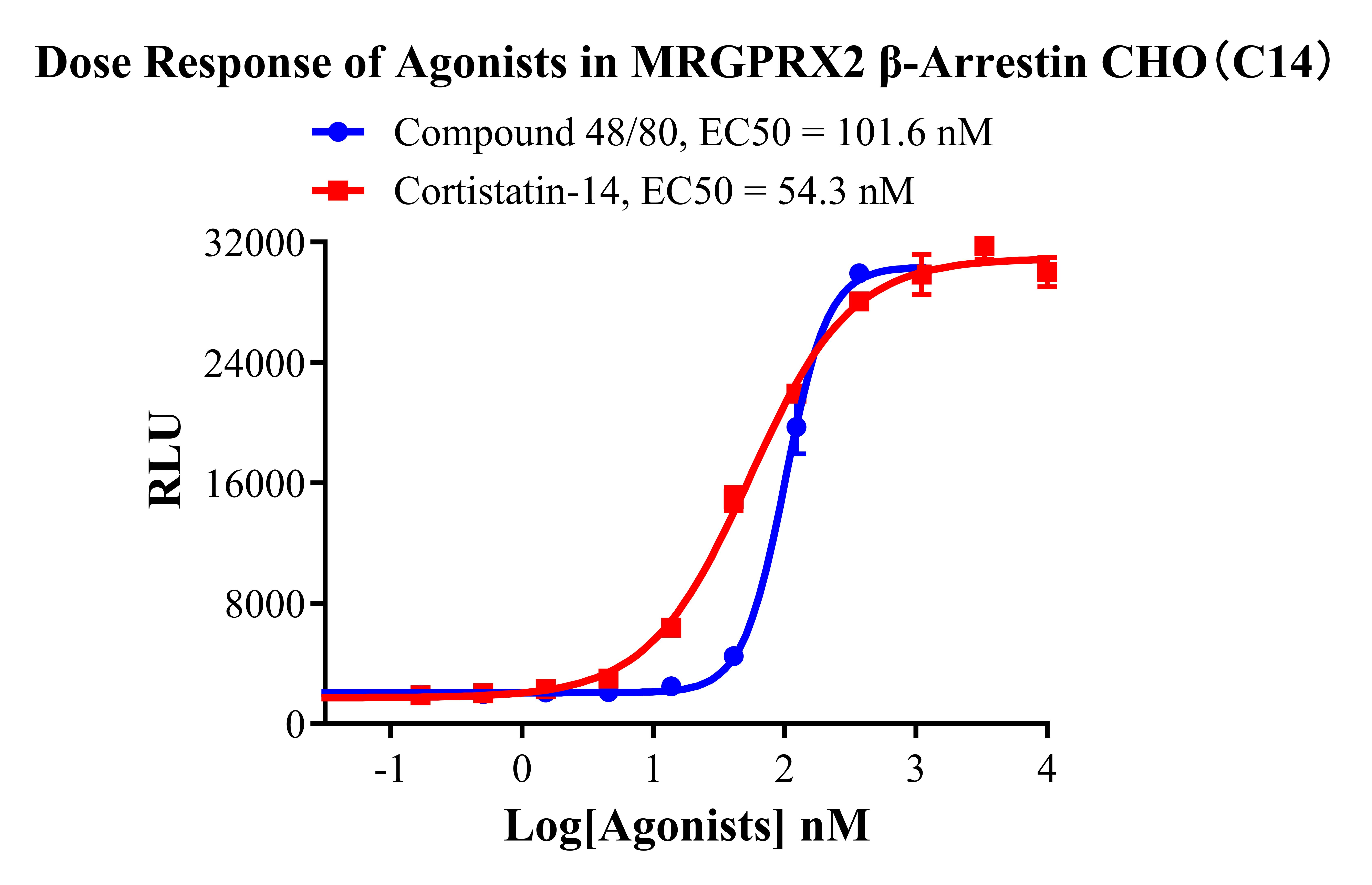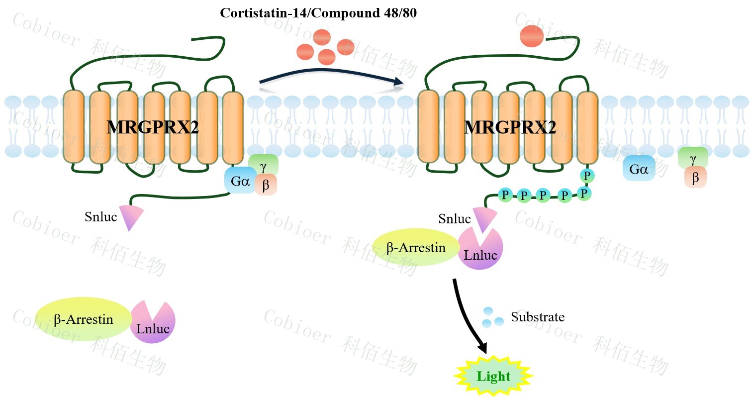 MRGPRX2 β-Arrestin CHO 報告基因藥靶模型很好的模擬了體內 MRGPRX2/β-Arrestin 的信號轉導過(guò)程,原理見(jiàn)下圖所示。當缺乏配體刺激時(shí),β-Arrestin 不與 MRGPRX2 結合, 融合β-Arrestin 的熒光素酶處于失活構象;當 MRGPRX2 遭遇配體刺激時(shí),融合熒光素酶報 告基因的β-Arrestin 被招募,使熒光素酶報告基因處于激活狀態(tài),加入其底物后發(fā)光信號增 強。![]() Figure 1. MRGPRX2 β-Arrestin CHO 細胞模型原理圖 |
