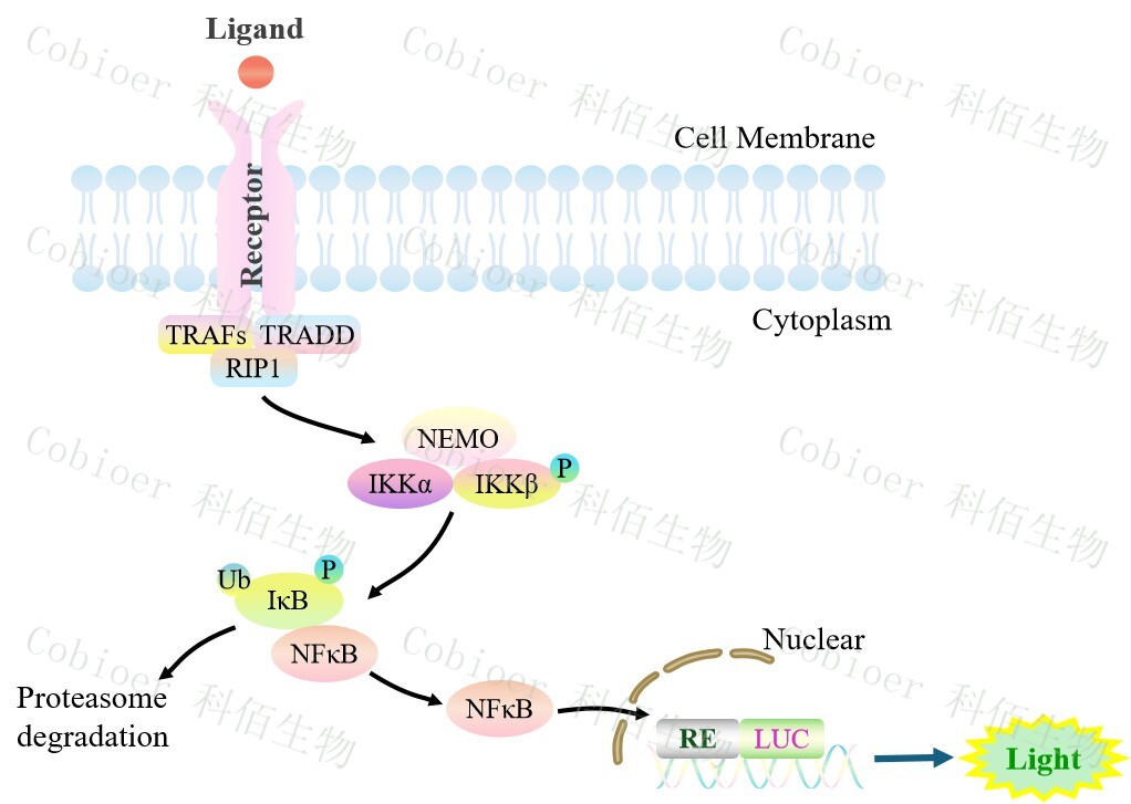 NFκB-Luc HEK293 報告基因細胞,是由 NFκB 調控并表達 Luc 熒光素酶 報告基因的 HEK293 細胞。配體與受體結合后,激活 NF-κB 的原理見(jiàn)下圖所示。![]() Figure 1:NFκB-Luc HEK293 細胞模型原理圖 |