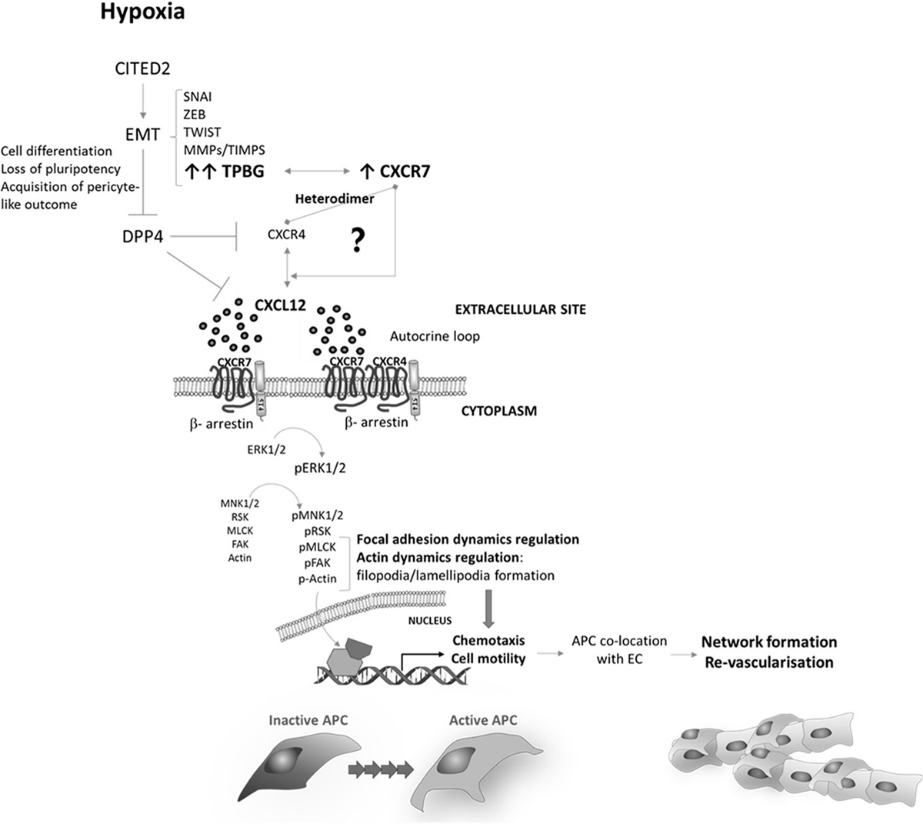 CXCL12和CXCR4表達與許多腫瘤的發(fā)生有關(guān),有研究表明CXCR4的表達有助于癌細胞擴散到CXCL12高表達的組織中,比如肺、肝、淋巴結和骨髓。在小鼠胚胎干細胞、成纖維細胞和癌細胞中,TPBG的上調與CXCL12的誘導有關(guān)。TPBG通過(guò)抑制負責CXCL12裂解的蛋白酶DPP4來(lái)延長(cháng)CXCL12的生物利用度。CXCL12通過(guò)結合CXCR4以及非典型CXCR7和CXCR4/CXCR7異源二聚體觸發(fā)細胞內信號傳導。CXCR4和CXCR7也可以與β-arrestin-2形成復合物,從而促進(jìn)受體內化并將信號重定向到其他不依賴(lài)G蛋白的途徑如p38 MAPK/ERK 信號通路。在某種程度上說(shuō)明5T4可通過(guò)CXCR4/CXCL12通路來(lái)影響腫瘤細胞的發(fā)生、發(fā)展、轉移等。
