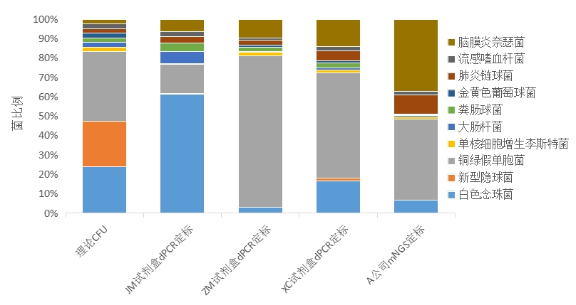 同時(shí),我們也對此產(chǎn)品進(jìn)行了mNGS的檢測,在無(wú)差別檢測比對得到的數據中,10個(gè)菌都可以檢出,但是比例與數字PCR也有同樣的差異。