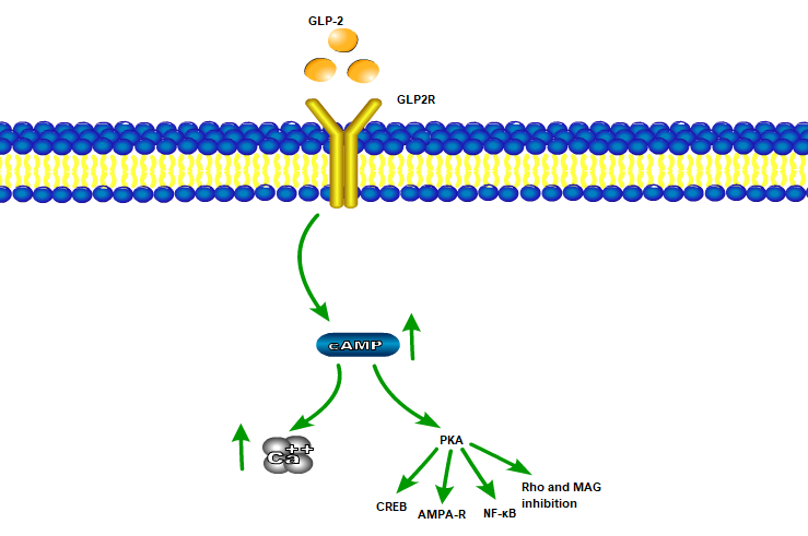 胰高血糖素樣肽2受體(glucagon like peptide 2 receptor, GLP2R)屬于G蛋白偶練受體超家族,是胰高血糖素受體家族的成員,同GLP-1、胰高血糖素和GIP的受體有較高的同源性。人GLP2R基因定位于染色體17p13.3,編碼553個(gè)氨基酸。GLP2R主要表達于胃腸道中,GLP-2是一種有效的腸道生長(cháng)因子,結合GLP-2R后,激活腺苷酸環(huán)化酶,呈劑量依賴(lài)性的產(chǎn)生大量cAMP,激活PKA,從而使cAMP反應元件(CRE)和AP-1 依賴(lài)的轉錄增加,使被調控基因的表達發(fā)生變化。